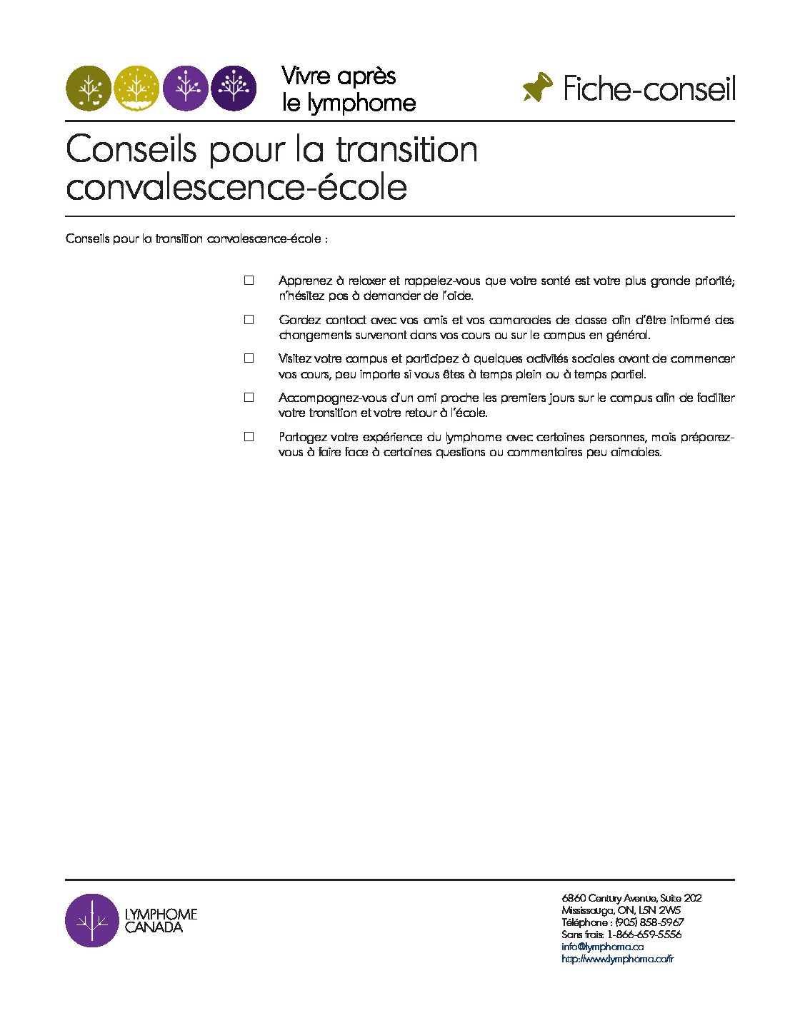 Ne soyez pas surpris si vous trouvez que votre transition vers votre nouvelle normalité vous épuise physiquement et émotionnellement. Combiner ces défis avec un programme scolaire peut accroître le stress lié à cette étape de votre expérience avec le lymphome. Voici quelques conseils pour vous aider dans votre transition et votre retour à l’école :